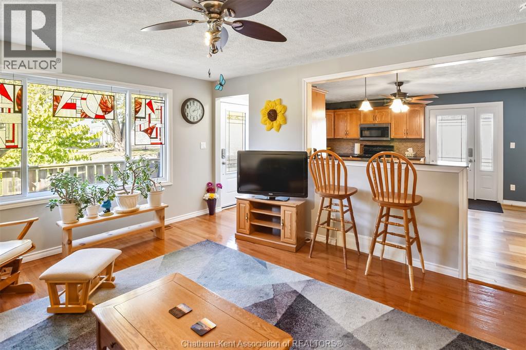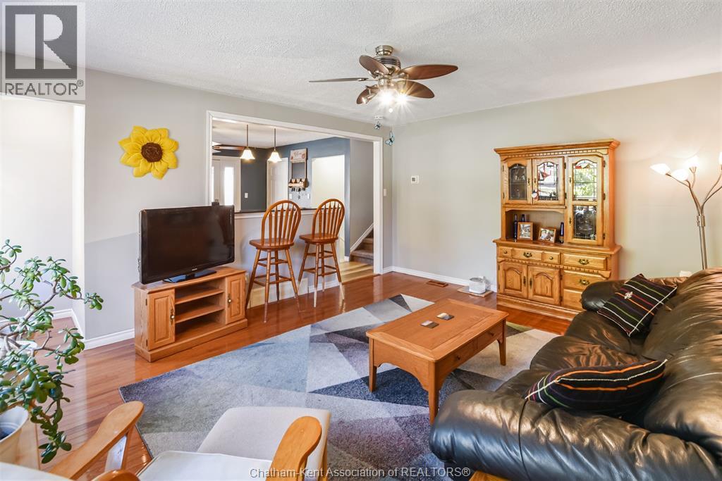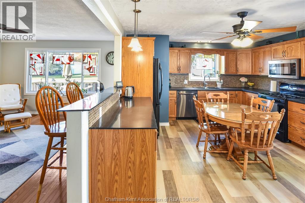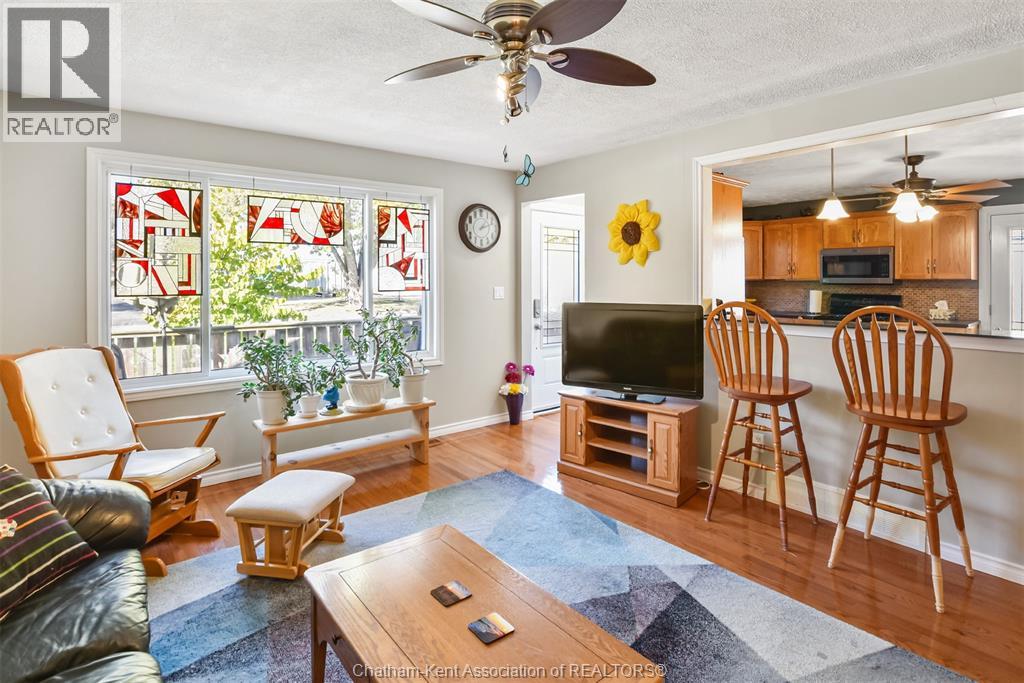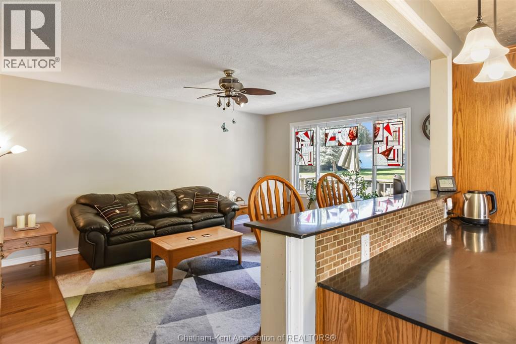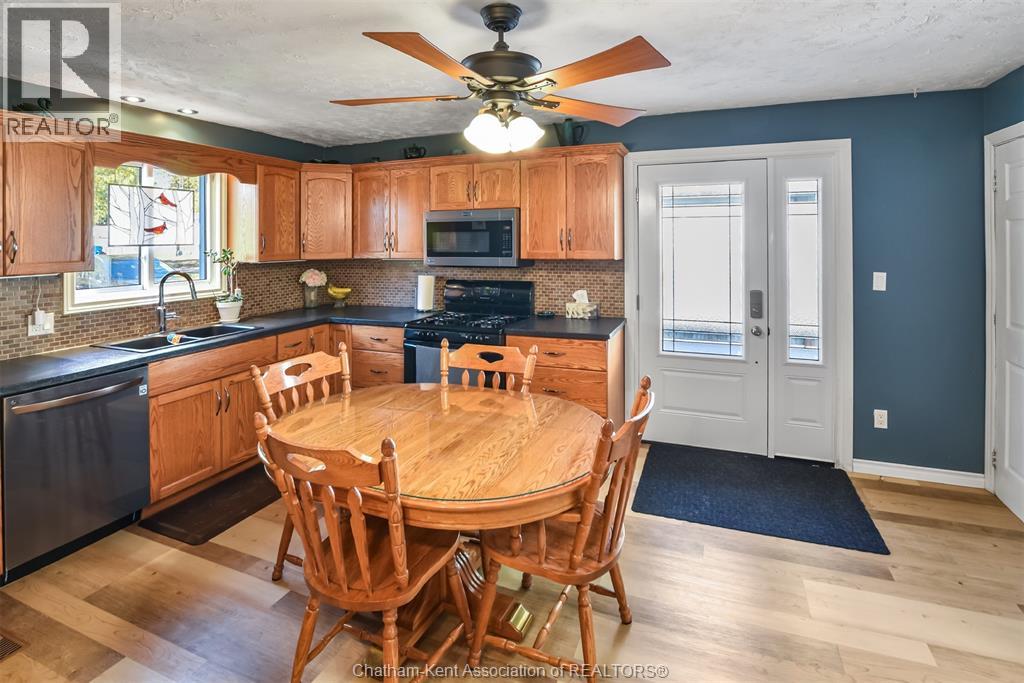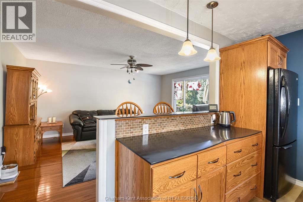 414 Catherine St in desirable Blenheim has a terrific combination of features. Starting off with a dead end street, mature trees for privacy, fenced rear yard and 14' x 25' wired, insulated and heated detached garage or workshop. Excellent road appeal with the brick exterior, metal roof on both house and garage, new siding and exterior doors in 2023. Plenty of room for parking with the long double drive. Side entry into an open concept oak kitchen with breakfast bar open to the living room creating an inviting and bright living space. This kitchen has plenty of cabinetry plus room for a kitchen table alongside the working bar area, dishwasher and built-in microwave. Upper level has 3 bedrooms and a full 4 pc bath. Finished lower level with family room and bright windows, (not being deep in the ground like a typical basement). Utility room with laundry, furnace, storage and a 2 pc bath. The furnace was new in 2021 and a new ERV in 2024. (id:4069)
