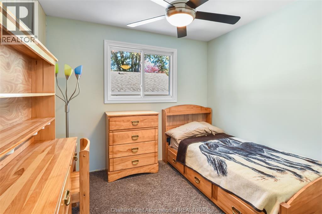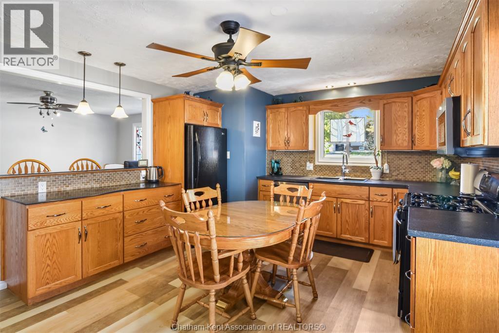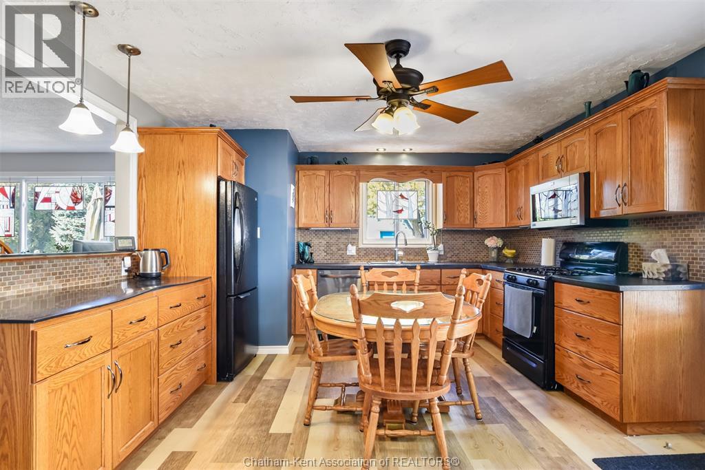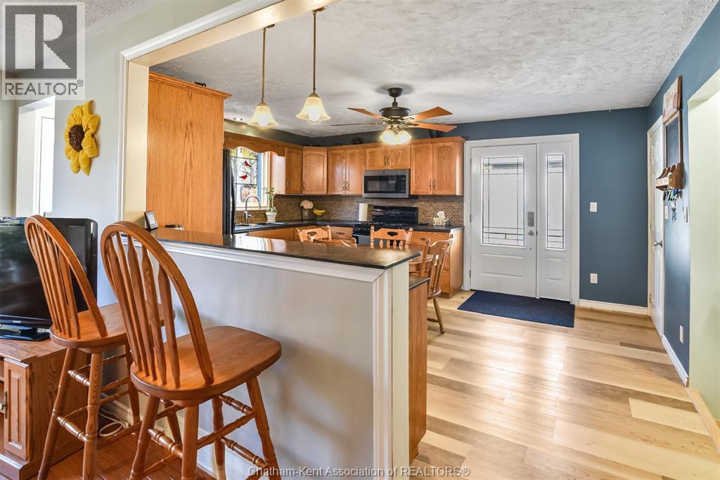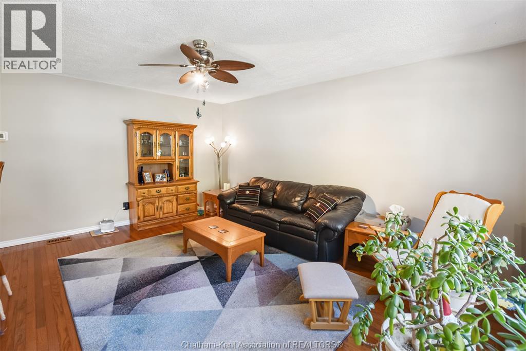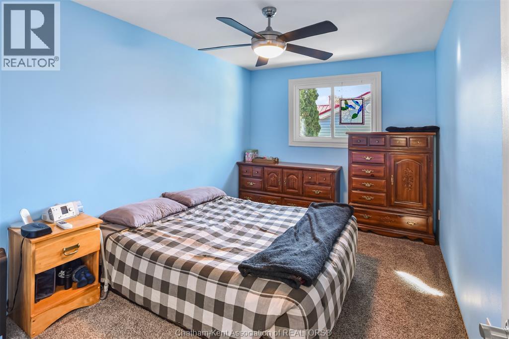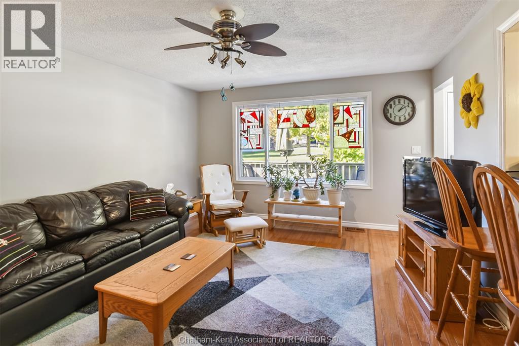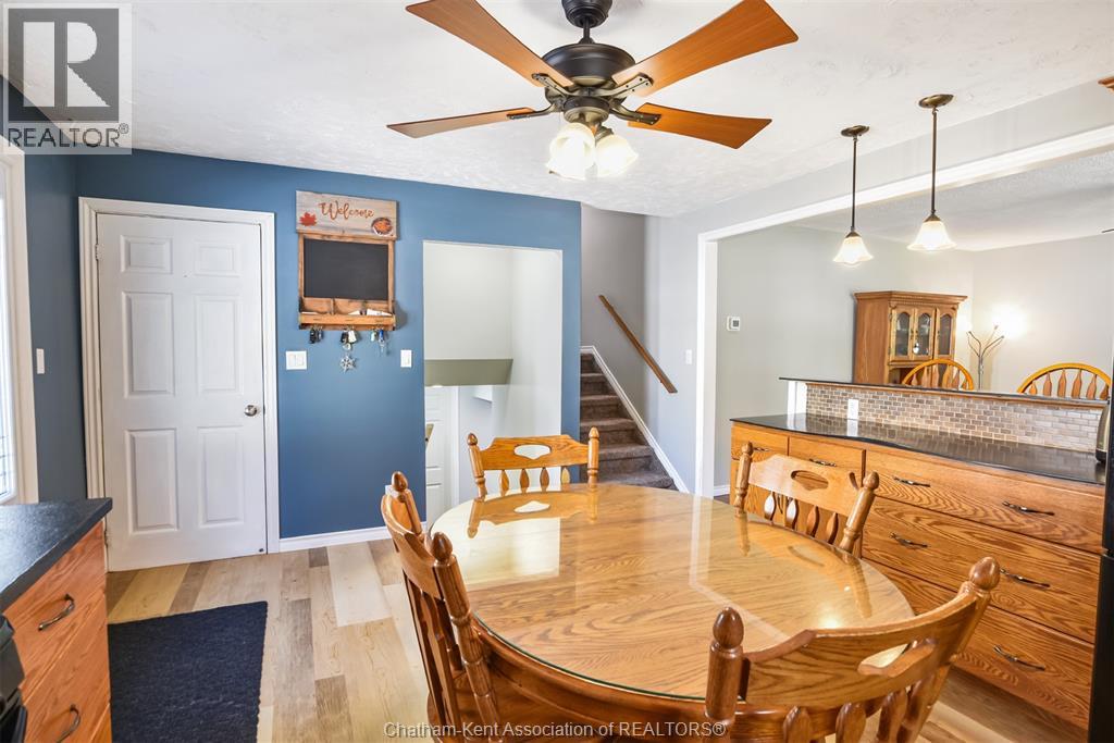 414 Catherine St in desirable Blenheim has a terrific combination of features. Starting off with a dead end street, mature trees for privacy, fenced rear yard and 14' x 25' wired, insulated and heated detached garage or workshop. Excellent road appeal with the brick exterior, metal roof on both house and garage, new siding and exterior doors in 2023. Plenty of room for parking with the long double drive. Side entry into an open concept oak kitchen with breakfast bar open to the living room creating an inviting and bright living space. This kitchen has plenty of cabinetry plus room for a kitchen table alongside the working bar area, dishwasher and built-in microwave. Upper level has 3 bedrooms and a full 4 pc bath. Finished lower level with family room and bright windows, (not being deep in the ground like a typical basement). Utility room with laundry, furnace, storage and a 2 pc bath. The furnace was new in 2021 and a new ERV in 2024. (id:4069)